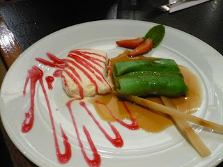 Finally, for dessert we went for the Pandan crepes, stuffed with caramelised coconut. These were served with vanilla ice cream, strawberry topping and a caramel like sauce (made with palm sugar maybe?). Beautifully presented, very tasty, and also a hit with Ms L when she tried mine.